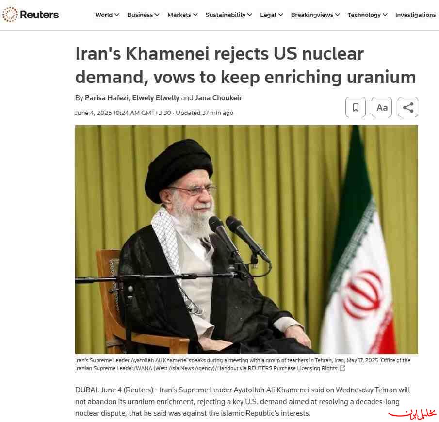 این روزنامه نوشت: رهبر ایران گفت: «ایالات متحده از پیش نتیجه مذاکرات را اعلام کرده است، نتیجه‌ای که همان توقف فعالیت‌های هسته‌ای و غنی‌سازی است. این مذاکره نیست، بلکه دیکته و تحمیل است.»