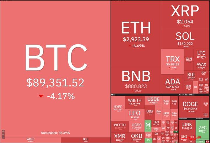 بیتکوین (BTC) تنها در عرض چند ساعت ۳,۸۹۹ دلار از دست داد و به ۸۹,۰۷۰ دلار سقوط کرد؛ افت منفی ۴.۱۹ درصدی که موجی از معاملات شتابزده را در بین سرمایهگذاران خرد و کلان رقم زد. اتریوم (ETH) با سقوط گسترده منفی ۶.۷۵ درصد تا ۲,۹۱۲.۶۰ دلار عقب نشست و بسیاری